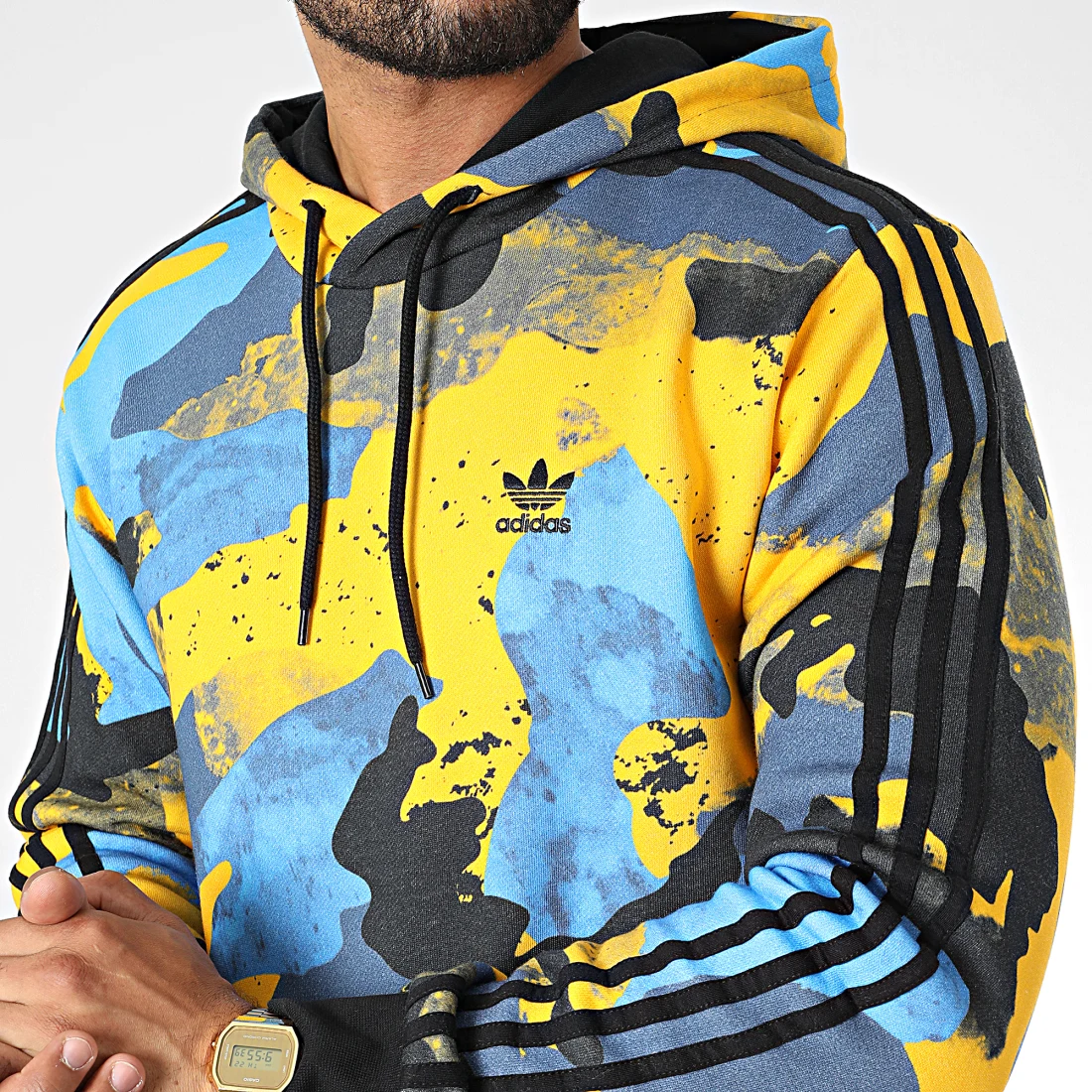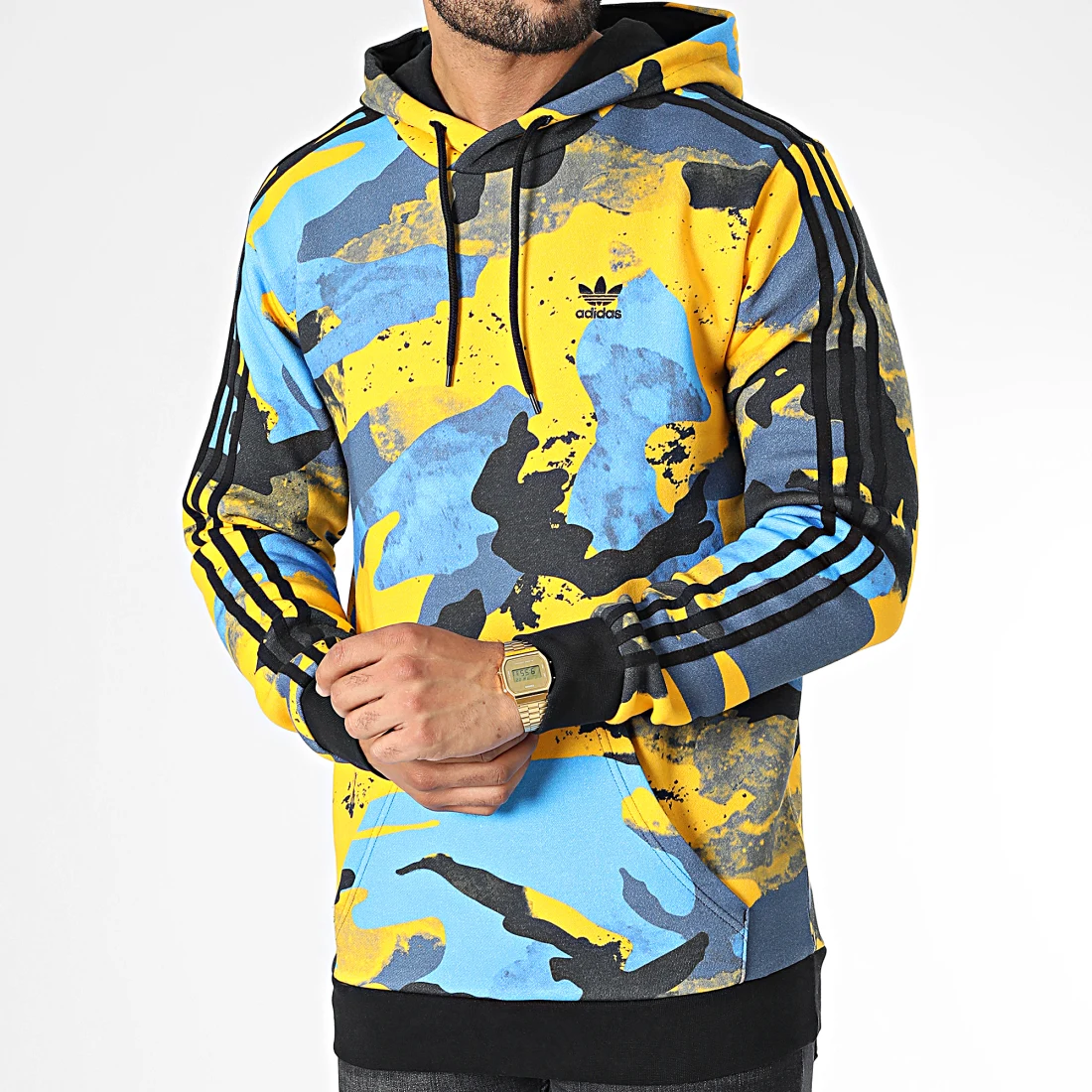 Le haut à enfiler, sans fermeture éclair, présente un imprimé camouflage moderne. Confectionné en molleton 70 % coton et 30 % polyester recyclé, il est doux, chaleureux et résistant. La capuche réglable, la poche kangourou et les poignets et ourlets côtelés offrent maintien et praticité.